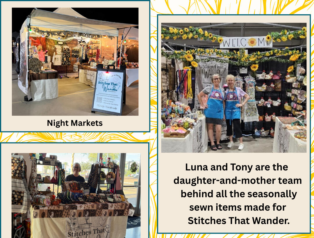As a small business owner, I wear all the hats, and it’s an over-40-hour work week. I am the social media tech, accountant, artist, designer, website designer, inventory manager, fabric and supply buyer, sewist, teacher, booking agent for all markets and events, booth layout designer, and manufacturer of all items. I am constantly working on my small business and sewing to keep up with inventory.It does, however, take a village, as they say, to get it all done. I am blessed to have two people in my life who have signed up to volunteer for jobs they never applied for and don’t get paid for. Many of you have met my Mom, AKA Tony, at the various markets and events. She helps me out in SO many ways. She helps run the booth with me at markets and events, sew items, design patterns, and products that I sell in my booth at the various markets and events.I also have my Husband, Mike, who is the muscle behind the scenes, who transports, carries, and helps us set up and take down the booth each time.How it started: