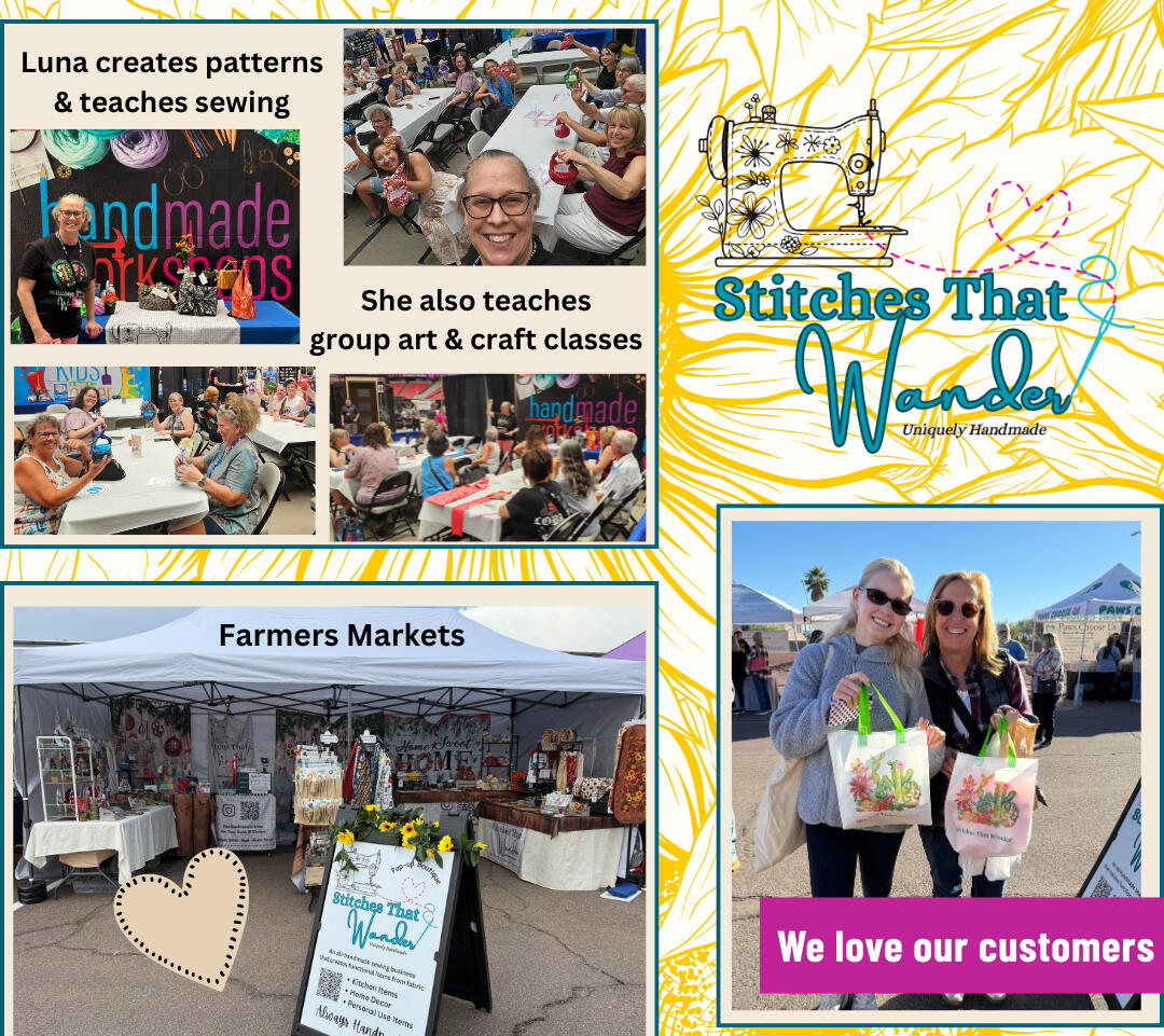 For as long as I can remember, I have been a mixed-media artist and sewist. I have tried just about every arts-and-crafts project out there.I named the business Stitches That Wander because, although sewing and artfully working with fabric are my primary focus,